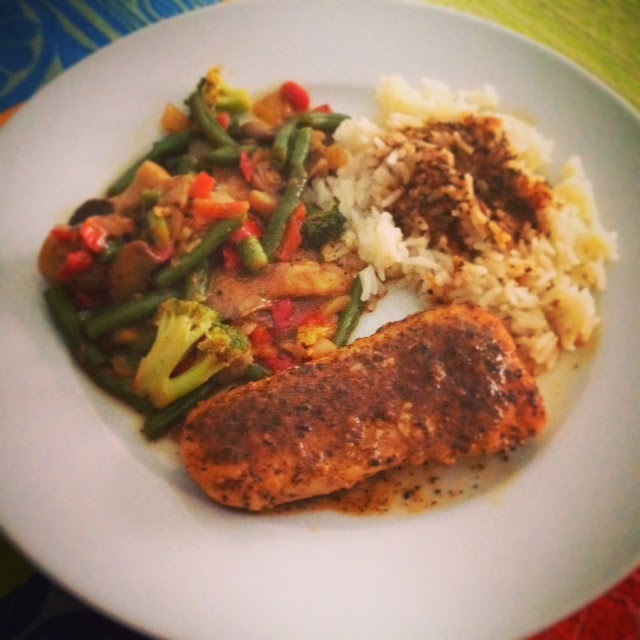 No seguimento da dieta, o jantar de hoje foi.... Salmão grelhado com arroz branco e legumes salteados.